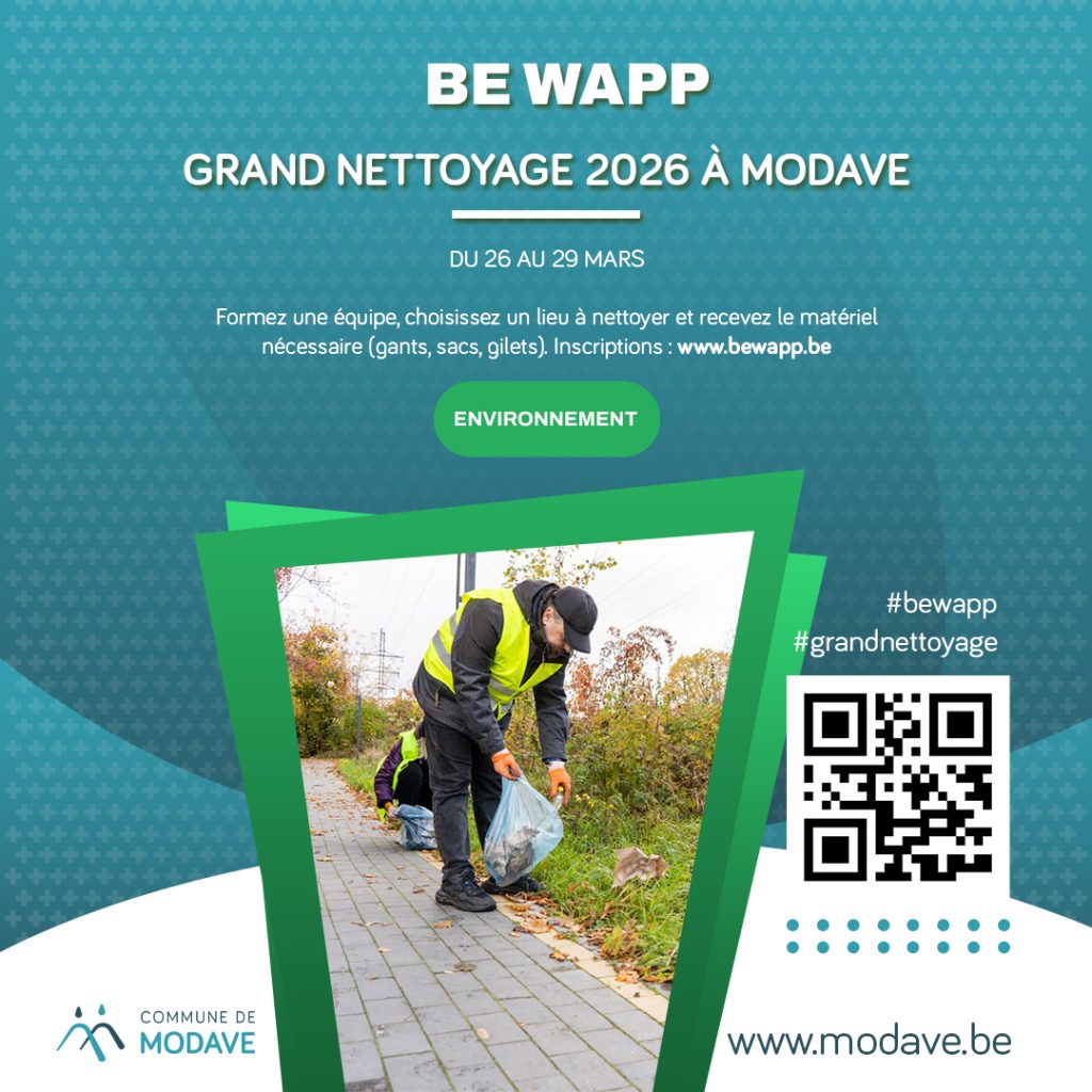 Du 26 au 29 mars, la Commune de Modave participe au Grand Nettoyage Be Wapp. Chaque année, des volontaires se mobilisent pour rendre nos rues, chemins et villages plus propres.